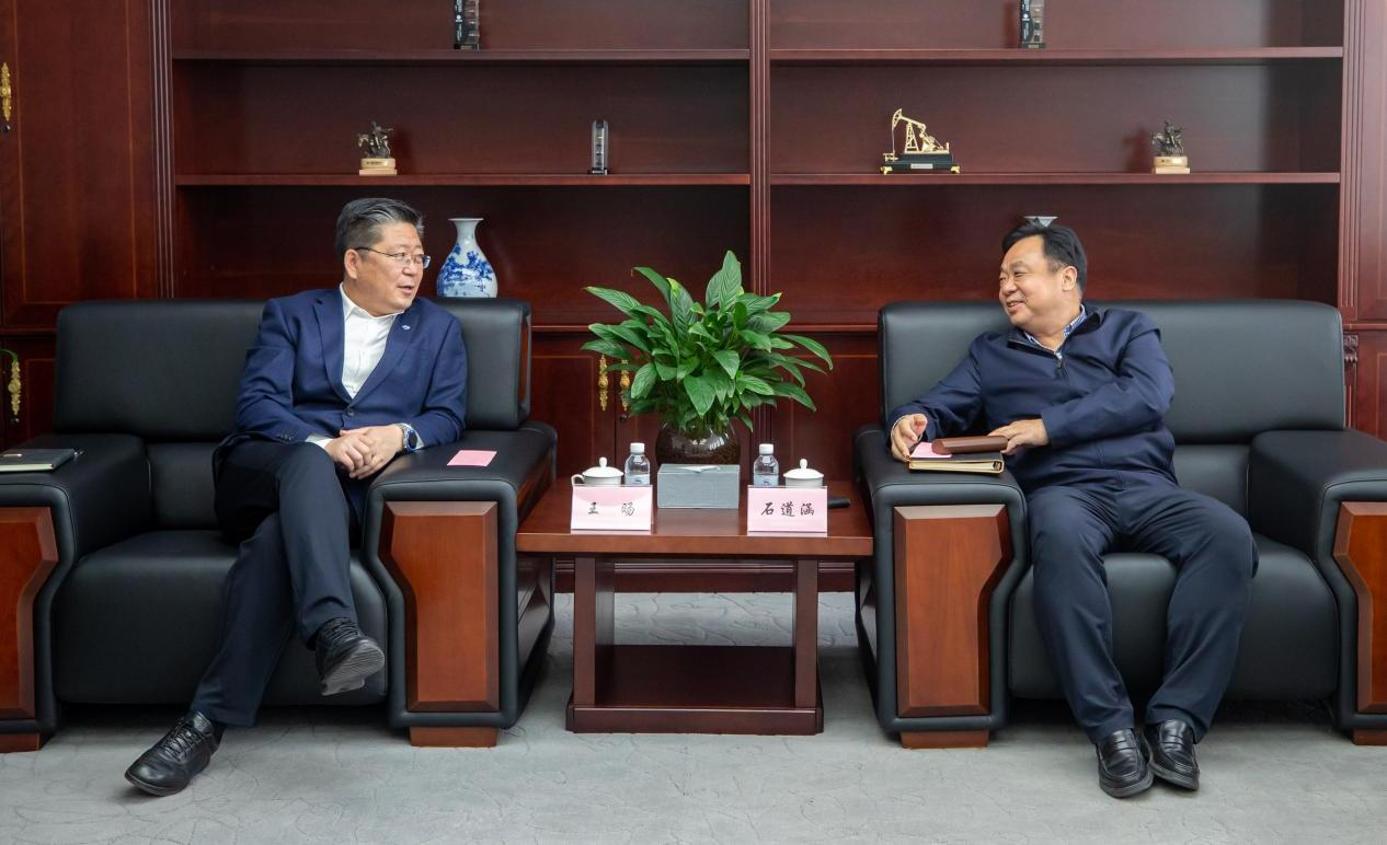22日上午,王旸一行與中國石油新疆油田公司執行董事、黨委書記石道涵,副總經理、黨委委員劉洪洲進行了深入交流。